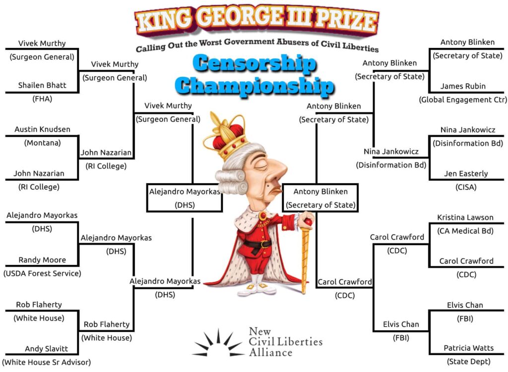 In keeping with the spirit of the madness of March and King George, we introduce two tournament brackets: one with 16 nominees comprising the state and federal agencies and officials who committed the worst abuses of civil liberties in 2023 and a second bracket devoted exclusively to 16 state and federal officials who dedicated their efforts to censorship and violating the First Amendment in 2023. Join us as we thumb our noses at these runaway regulators, officious bureaucrats, and god-complex governors. Watch gleefully as we force them to battle it out head-to-head in tournament-style match-ups.