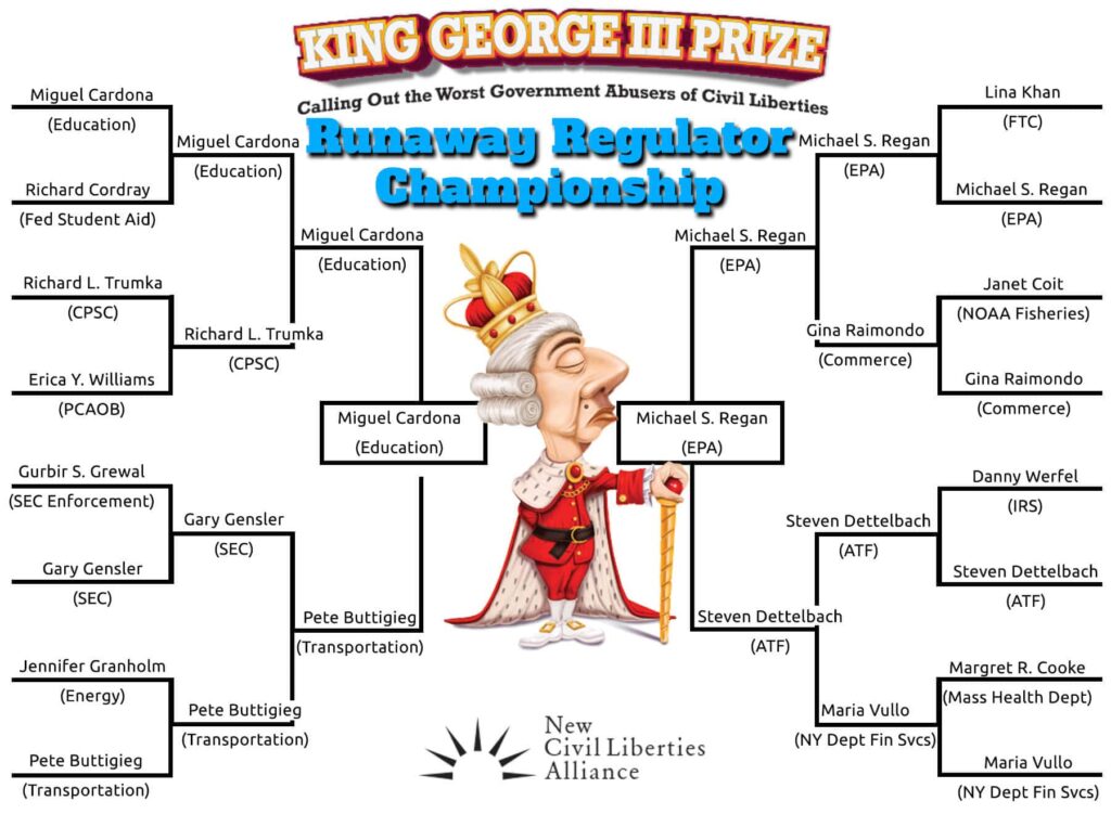 The New Civil Liberties Alliance is proud to announce the Fourth Annual King George III Prize – a campaign to call attention to the most egregious violations of our basic civil liberties by highlighting the people and institutions responsible for those abuses. In many cases, especially where the Administrative State is involved, the perpetrators are unelected, unaccountable bureaucrats protected by byzantine layers of regulatory process. Their violations are often hidden from public view, obfuscated by a lack of notice, circumvention of due process, and a damnably incurious press.