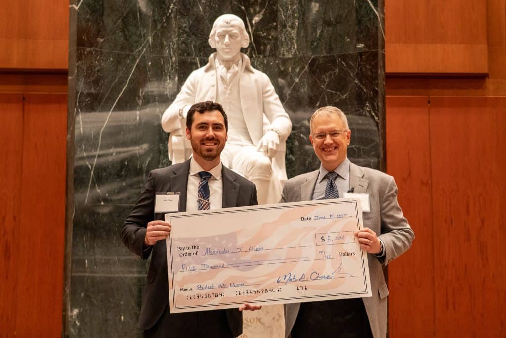 NCLA President Mark Chenoweth presents Alexander Phipps of the Scalia Law School with the Student Note Award at NCLA’s King George III Award Ceremony on June 10, 2025.